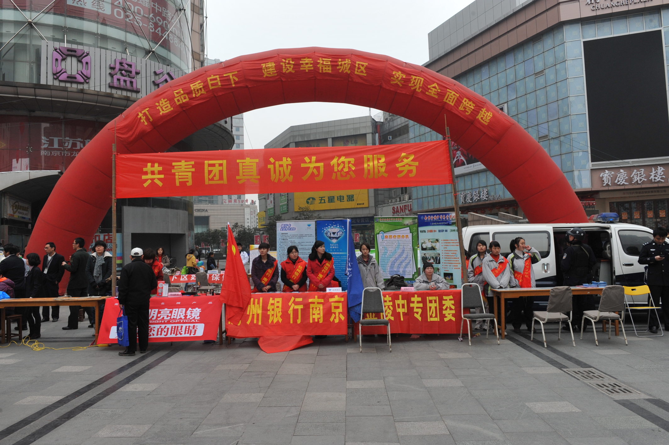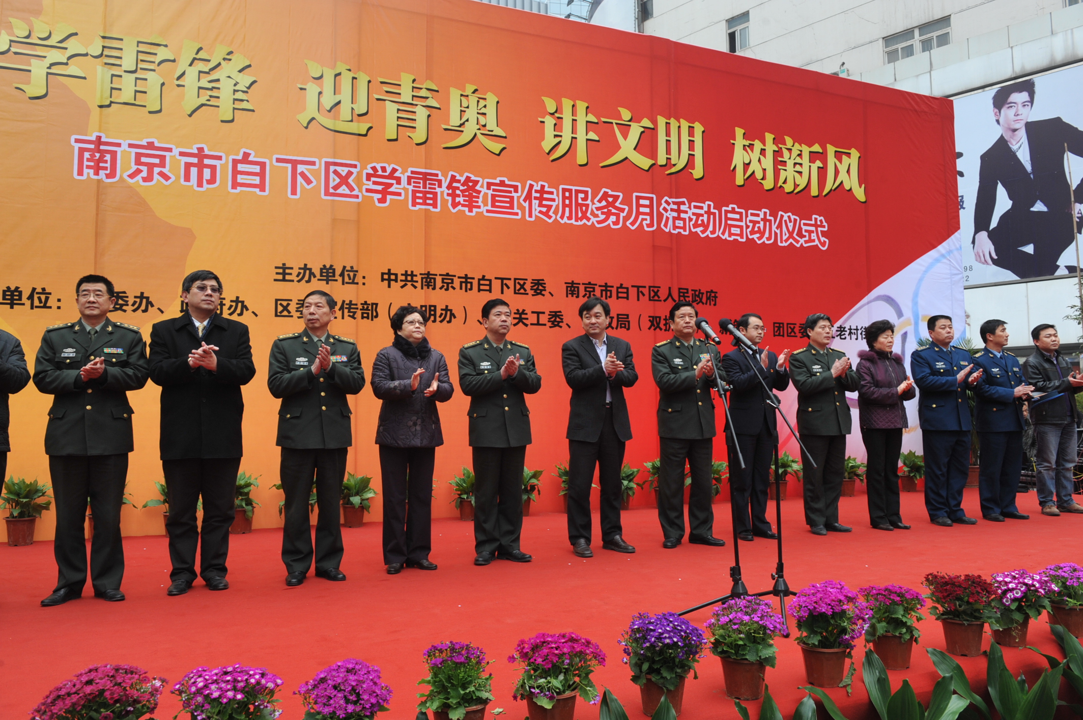 3月5日上午,“学雷锋,迎青奥,讲文明,树新风”——白下区学雷锋宣传服务月活动启动仪式在新街口正洪广场隆重举行,区委常委、宣传部长汪祥明主持,中国人民解放军理工大学政治部主任王大庆大校、解放军理工大学通信工程学院政委何伟鑫大校、解放军理工大学工程兵工程学院政委刘建新大校和总参第63研究所副所长王忠平大校等部队领导,区委副书记、区政府区长曹永林、团市委书记单晓峰、正区级领导单正薇、区人大常委会副主任谢德云、区政府副区长焦勇和区政协副主席姜旭光等市区各级领导,以及新街口商圈各大商家的领导等出席了启动仪式,参加今天活动的还有白下区机关和各街道的领导、区机关干部、驻区部队官兵、青年志愿者和社区群众的代表约500余人。